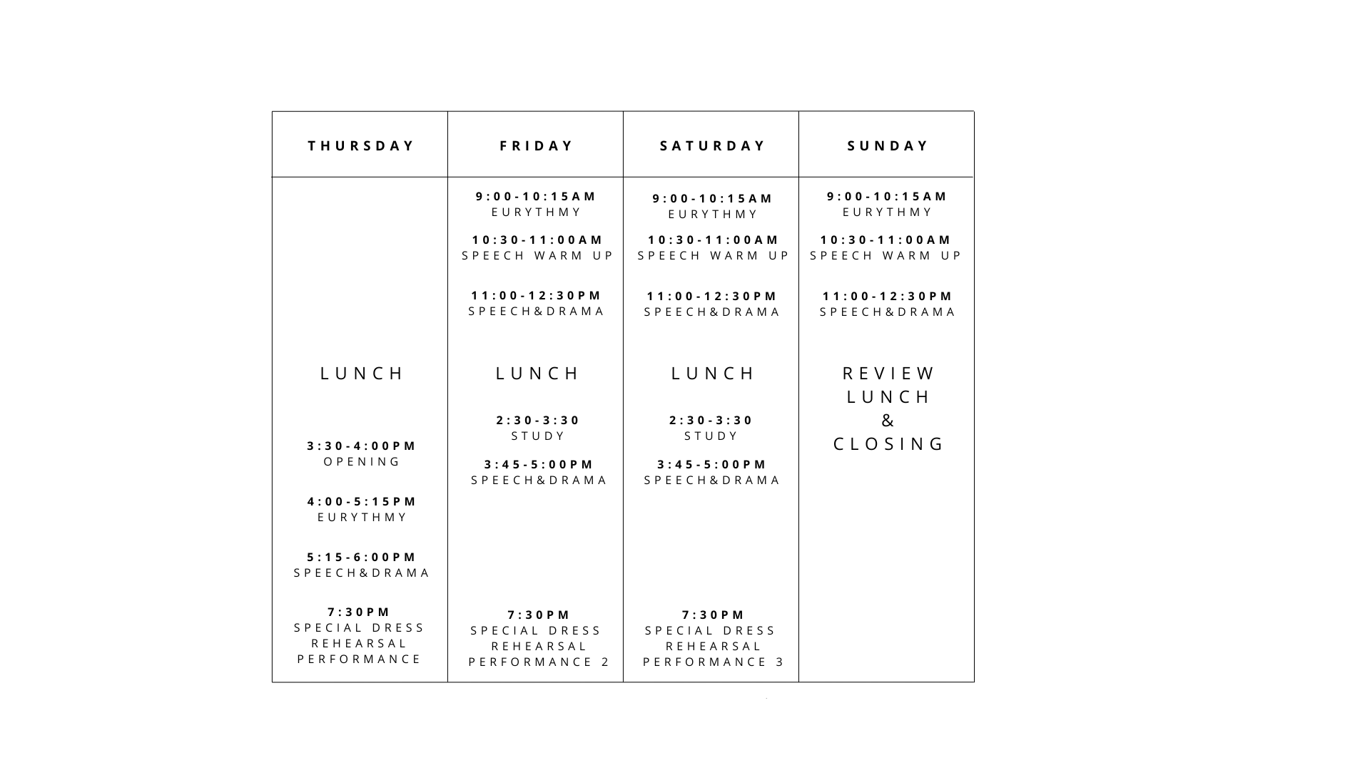 Classes begin Thursday and 3:30pm, run from 9am to 5pm Friday and Saturday and conclude Sunday at 1pm.